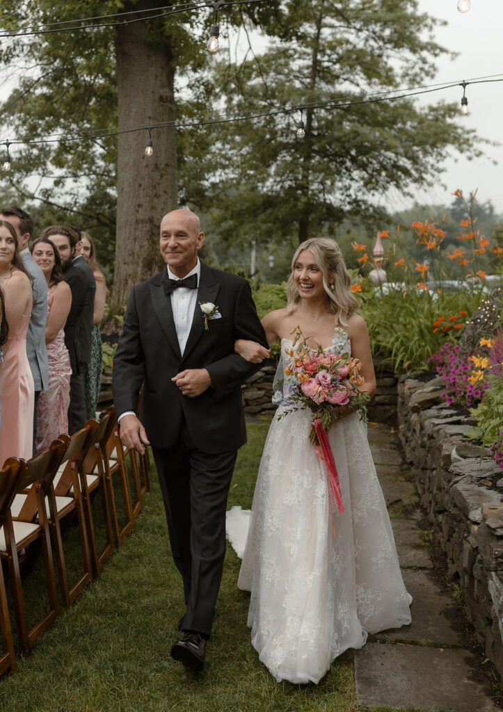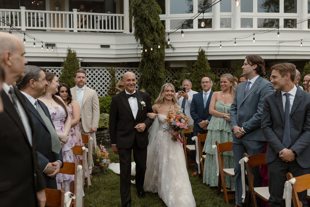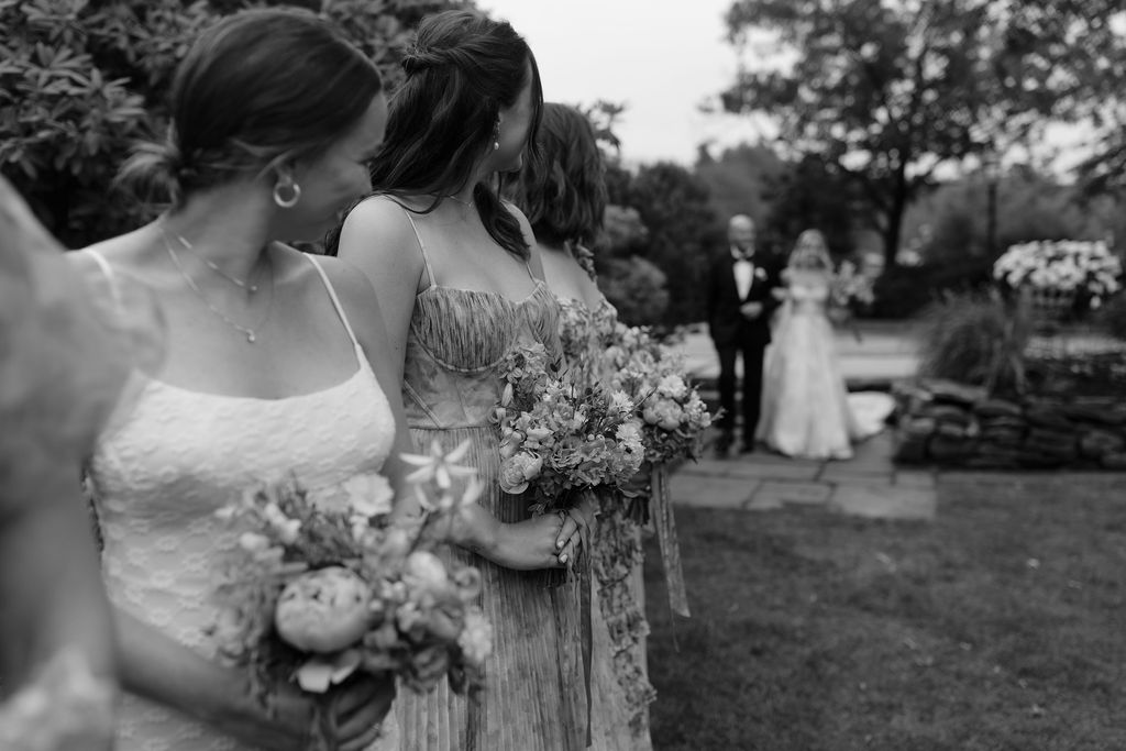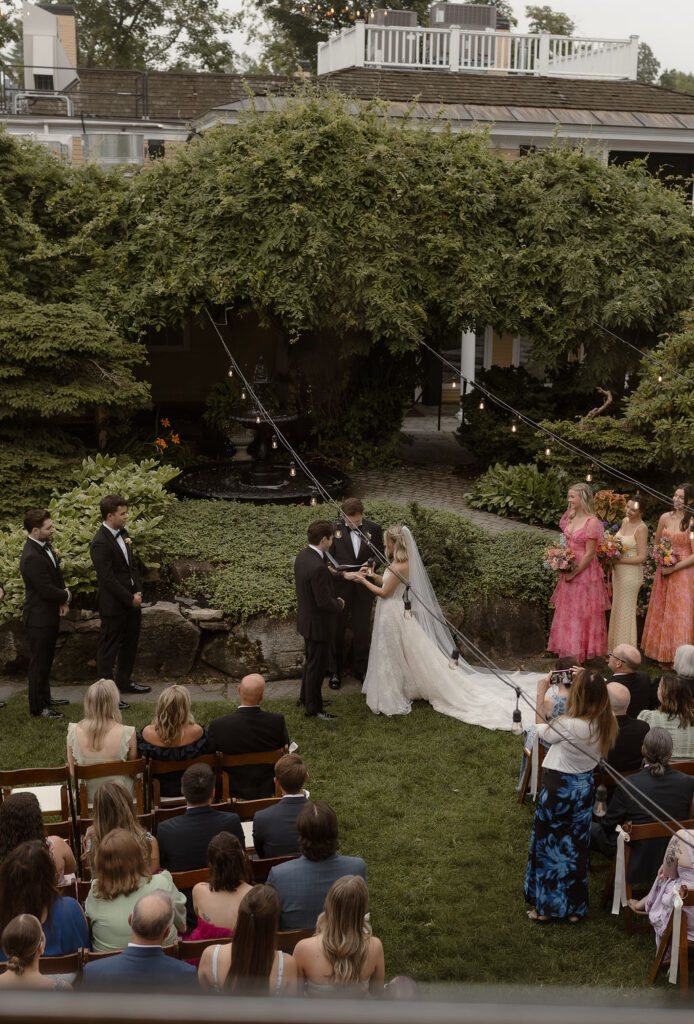The courtyard ceremony space at Bedford Village Inn is absolutely dreamy — full of greenery, brick pathways, and layers of visual depth. While I focused on Kalli’s walk down the aisle and their ring exchange up close, Kirsten captured guests reactions and emotion. When those photos came together in the gallery, it felt cinematic — like reliving the moment from every perspective.